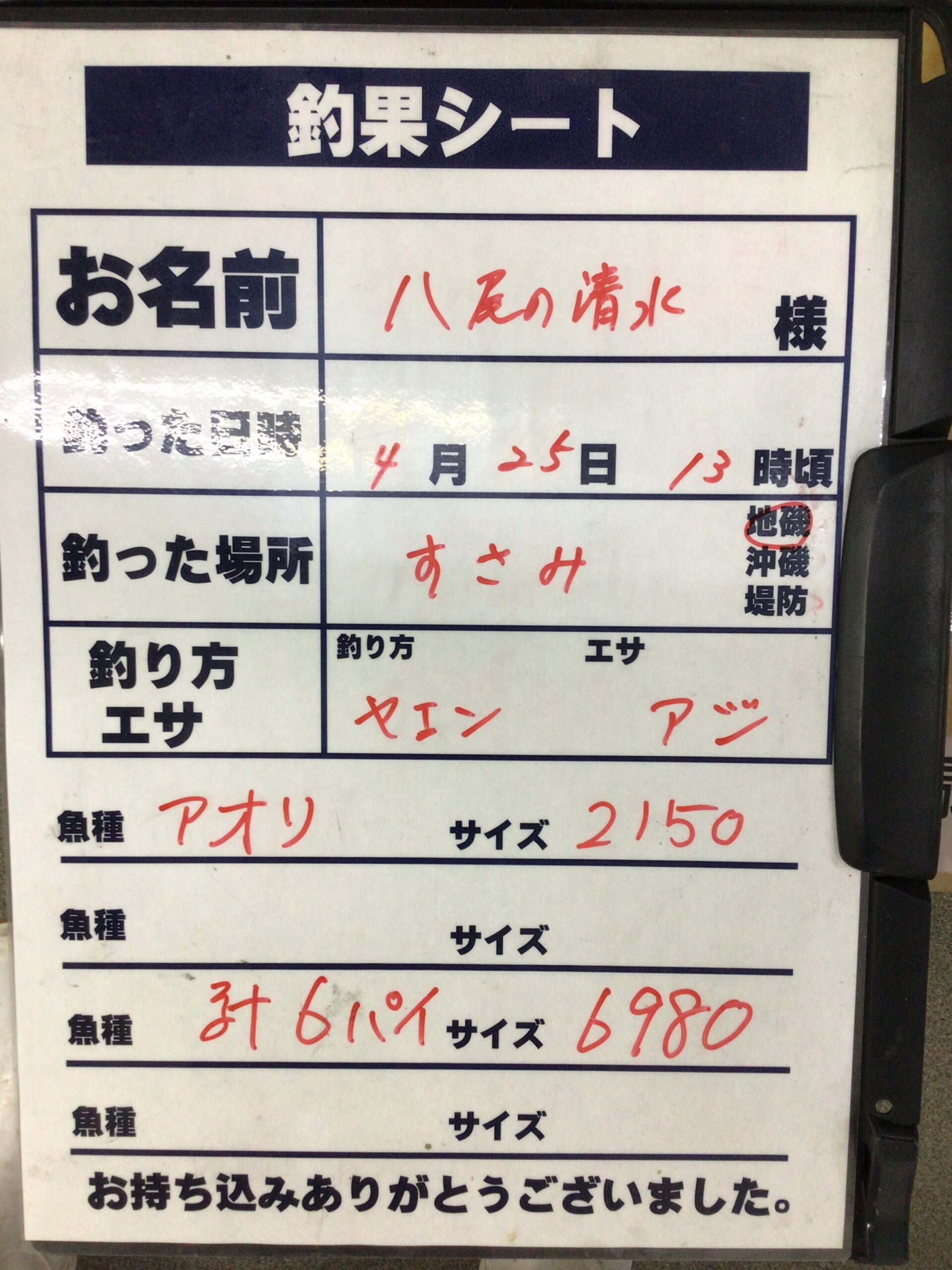 4/25 すさみ地磯にてアオリイカ2150g他5杯 計6980gの釣果