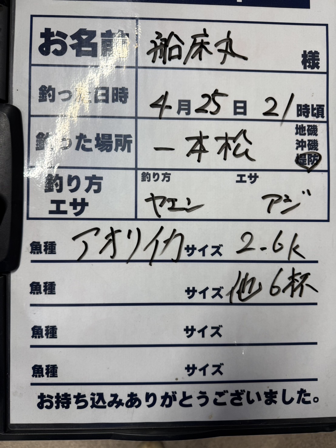 4/25 みなべ一本松漁港にてアオリイカ6杯 最大2640gの釣果