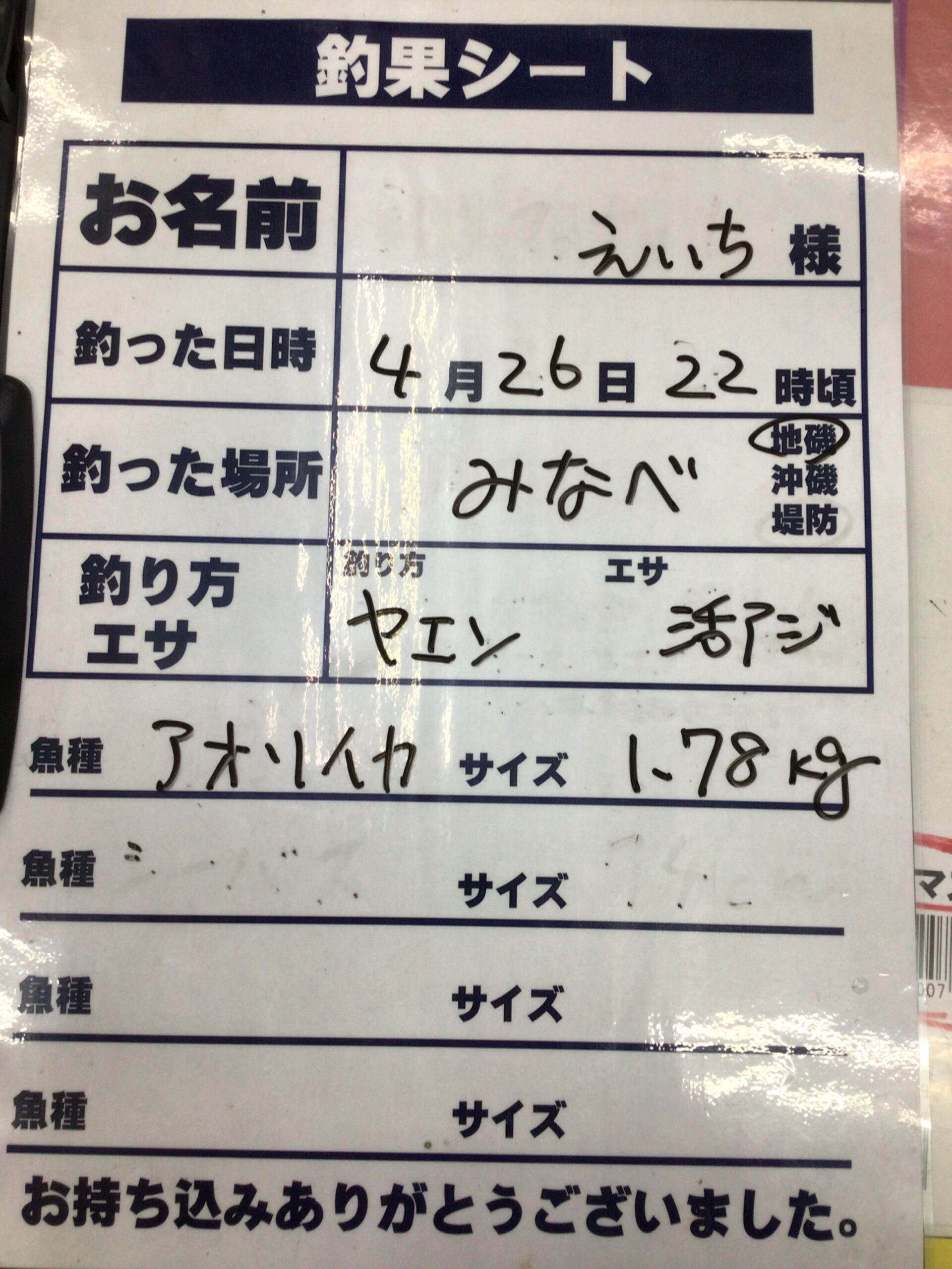4/26(土)みなべ地磯にてアオリイカ1780g