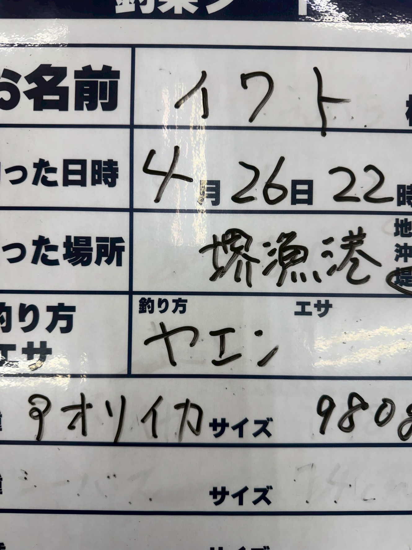 アオリイカ980g。ヤエン釣果。みなべ町堺漁港。イワト様。釣太郎