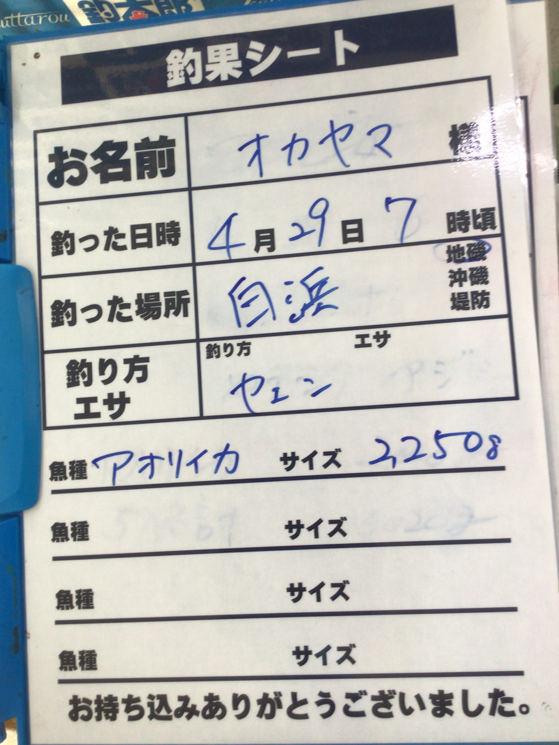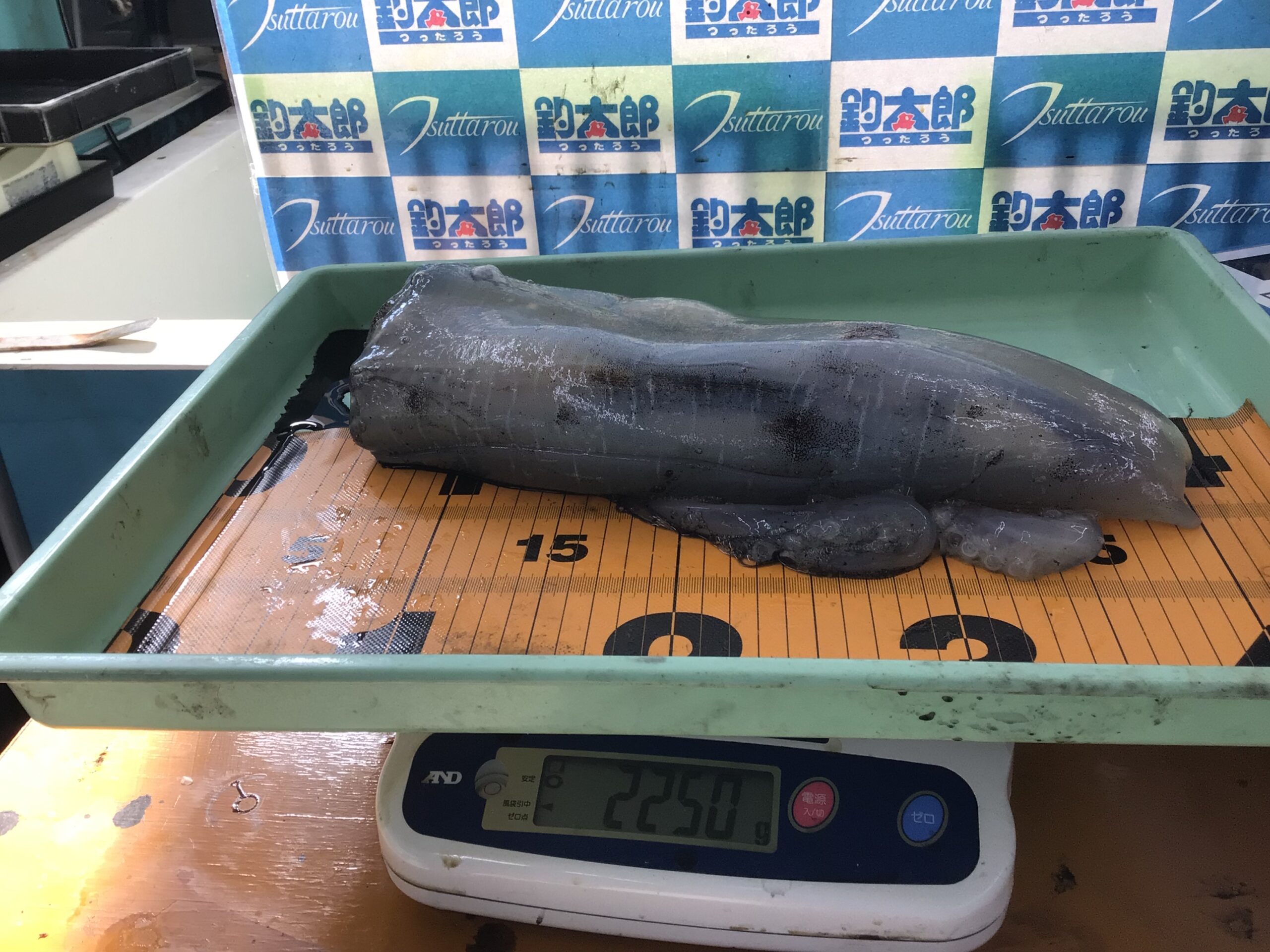 4/29 アオリイカの釣果 2,250 g 白浜地磯、ヤエン釣りにて