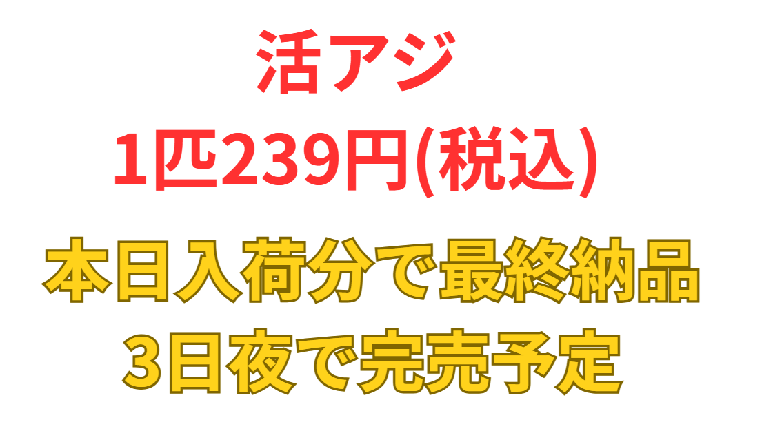 本日より活アジ1匹239円となりました。今日入荷便で売り尽くし終売です。
