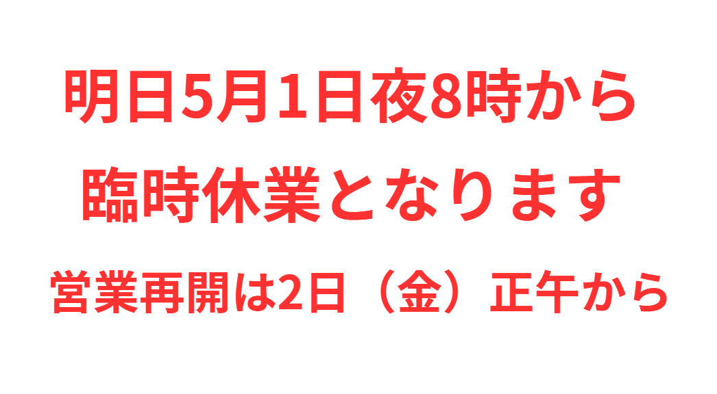 明日5月1日夜8時から臨時休業致します。