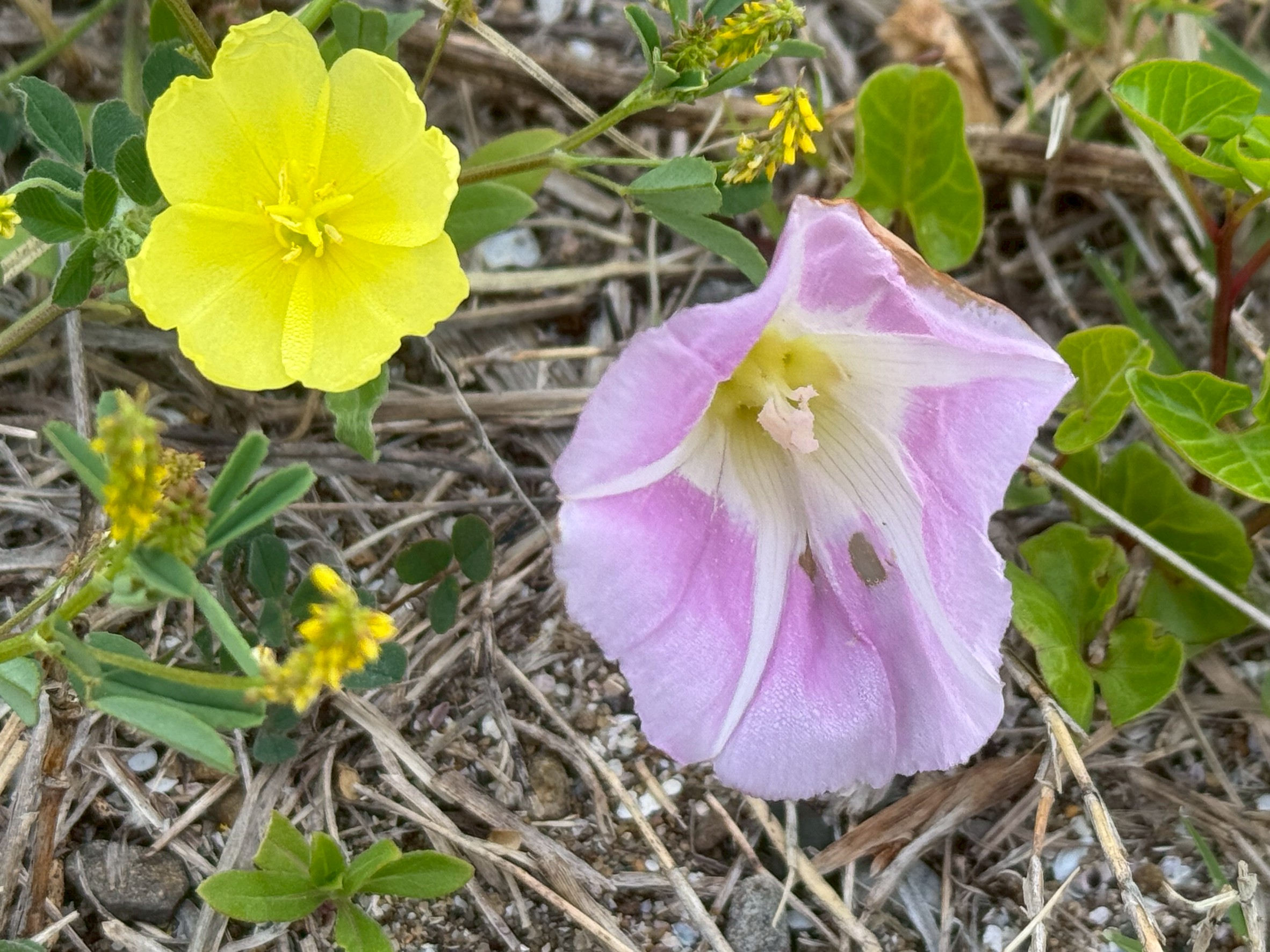 砂浜という厳しい環境の中で、鮮やかな花を咲かせるグンバイヒルガオとマツバウンランは、自然の力強さを感じさせてくれますね。
