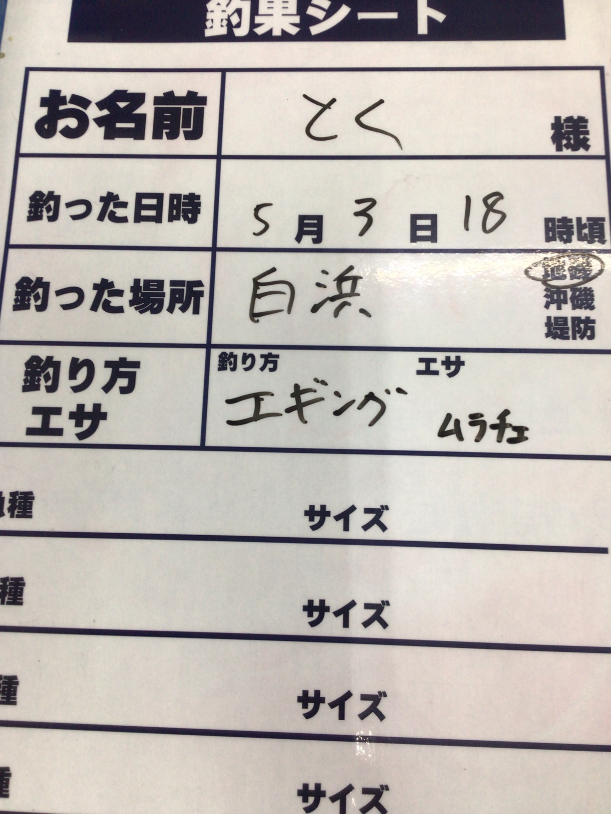 5/3 (土) 白浜地磯にてアオリイカ2210g 計3杯4860g エギ王 ムラチェにて