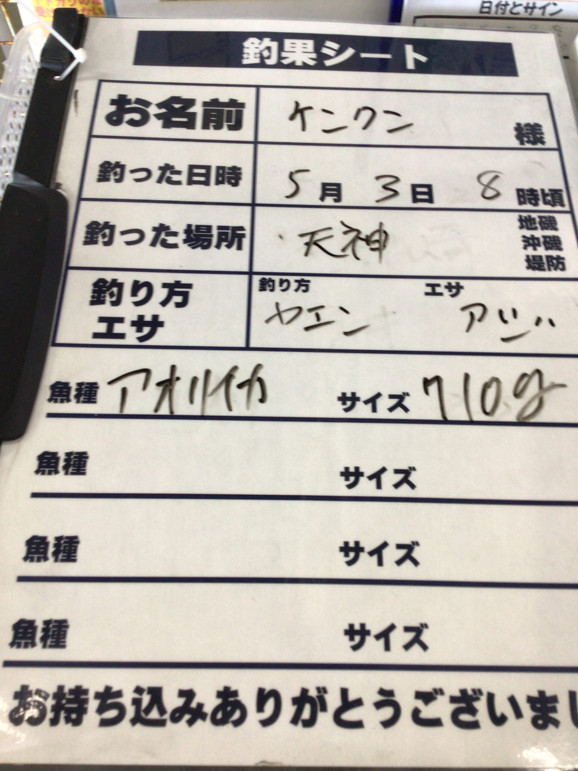 5/4 アオリイカの釣果 710g 天神崎釣り場、ヤエン釣りにて