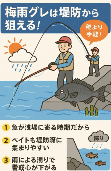 磯まで行かなくても、堤防から気軽にグレ釣りが楽しめるのが「梅雨グレ」の最大の魅力。