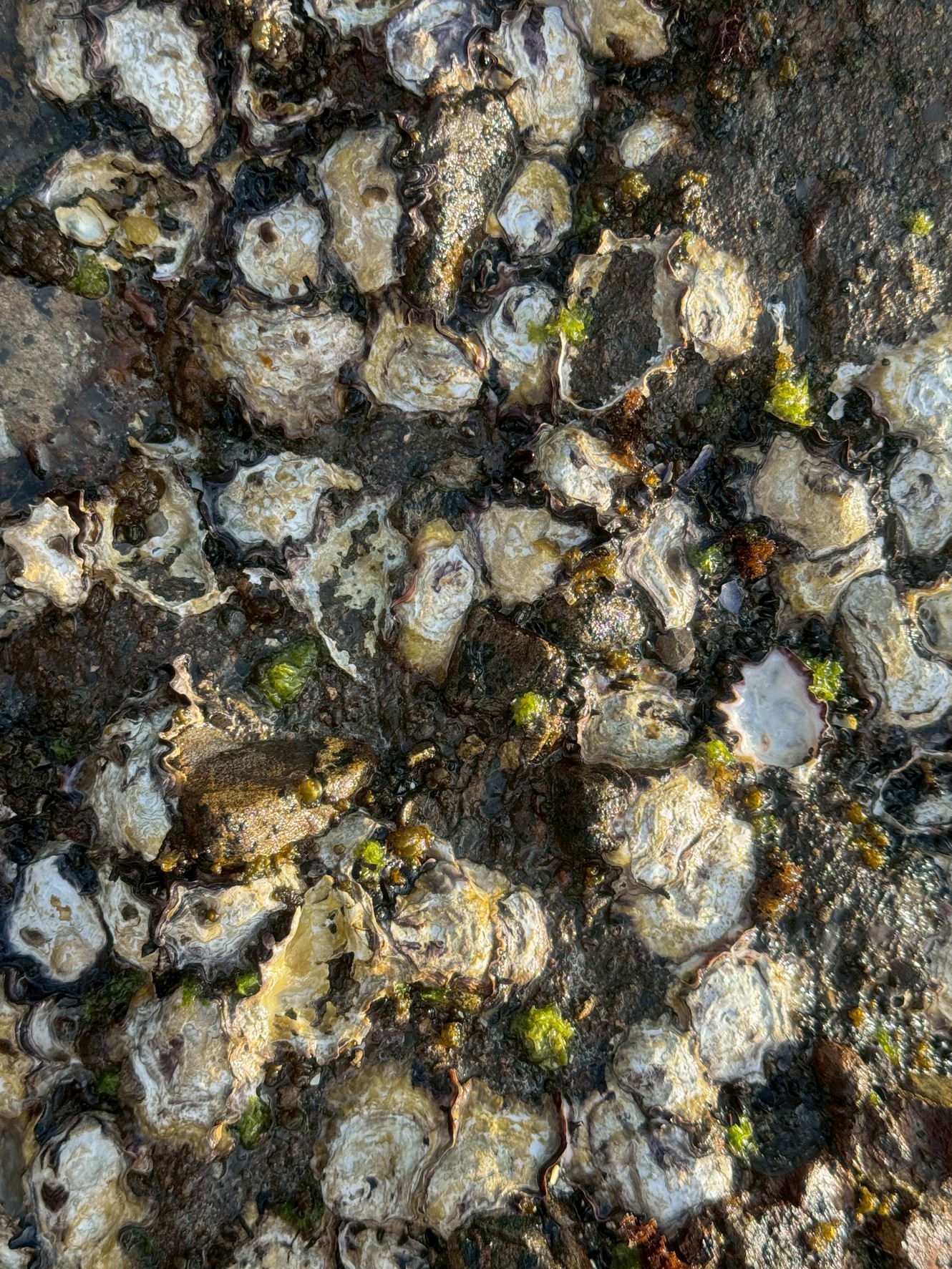 一口に岩牡蠣といってもいくつかの種類がありますが、南紀の潮間帯(潮が満ちたり引いたりするエリア)に密集しているのは、主にイワガキ(マガキ Crassostrea gigas も混じる場合がありますが、磯で問題となるのはこの系統や近縁種が多いです)や、場合によってはケガキ(Saccostrea属など、小さくても鋭利な種類)といった種類の可能性があります。