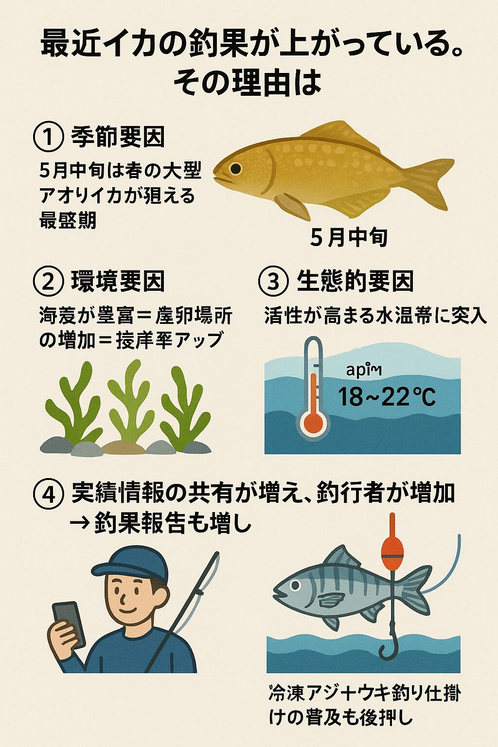 最近イカ(特にアオリイカ)の釣果が上がっている理由は、季節・環境・生態の3つの要因が絡み合っています。以下に釣り人目線で、わかりやすく解説します。