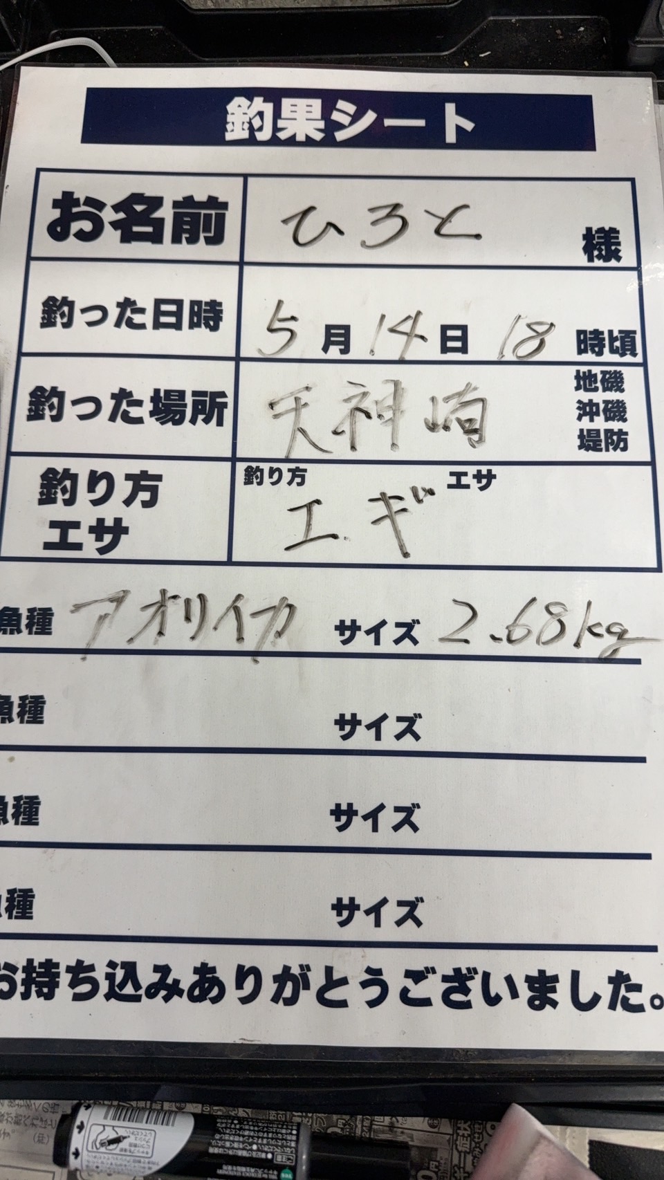 5/14 天神崎でエギングにてアオリイカ2.68K