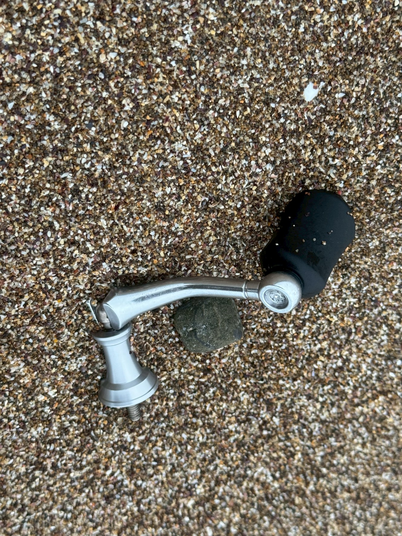 今回砂浜で見つかったハンドルは、黒いグリップノブとシルバーメタルのアームが特徴的なモデル。
