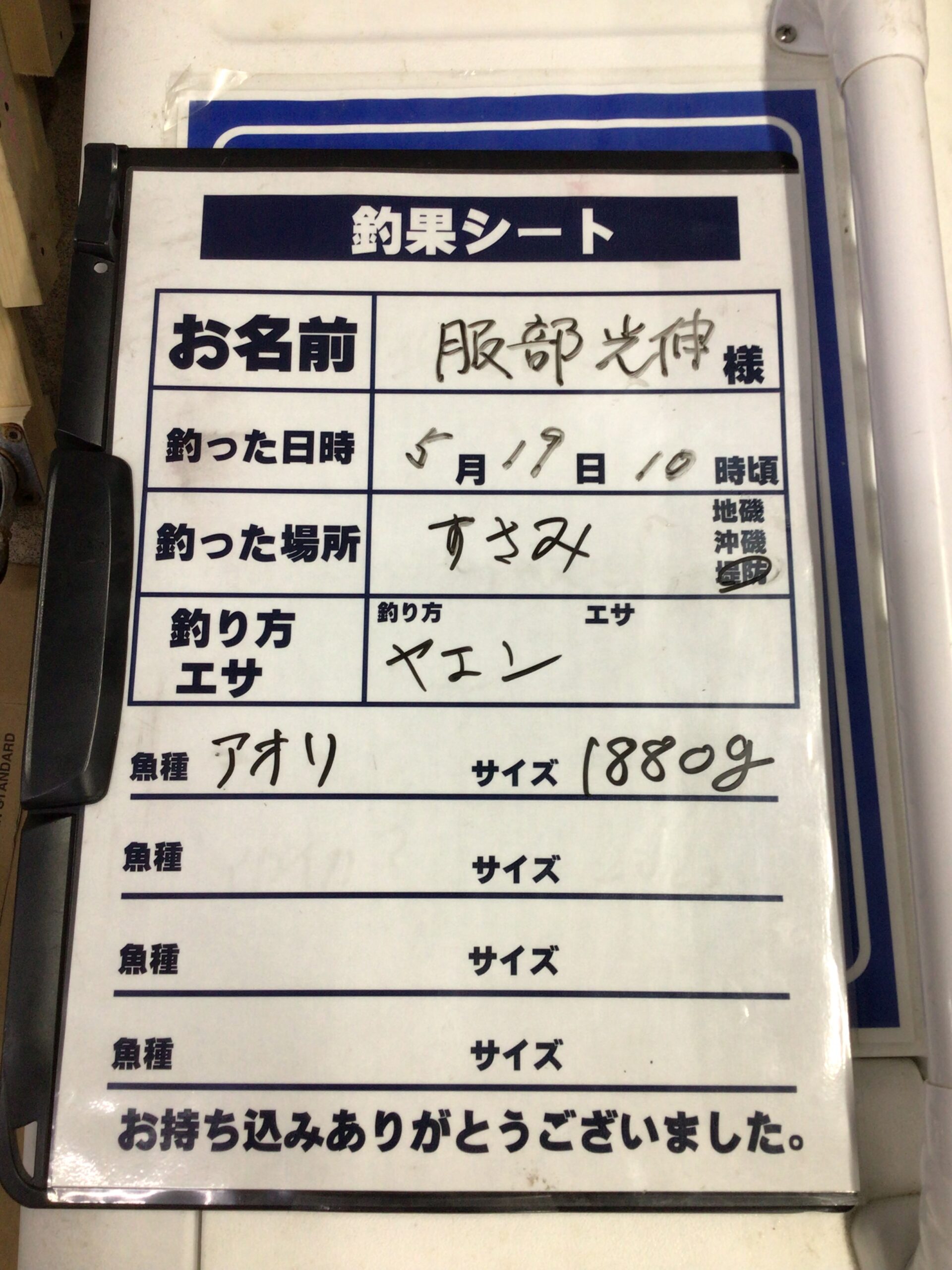 5/19 アオリイカの釣果 1880g すさみ堤防、ヤエン釣りにて