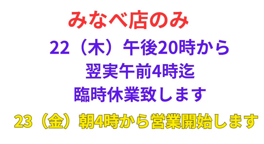 人手不足のため22(木)夜20時から23(金)朝4時まで、みなべ店のみ一時休業致します。