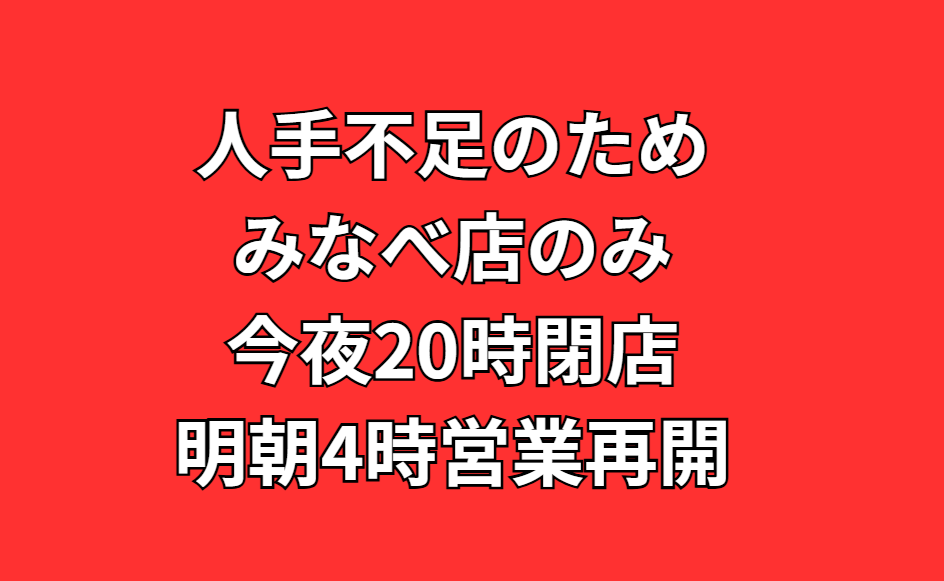 人手不足のため、みなべ店本日朝4時営業再開となります。