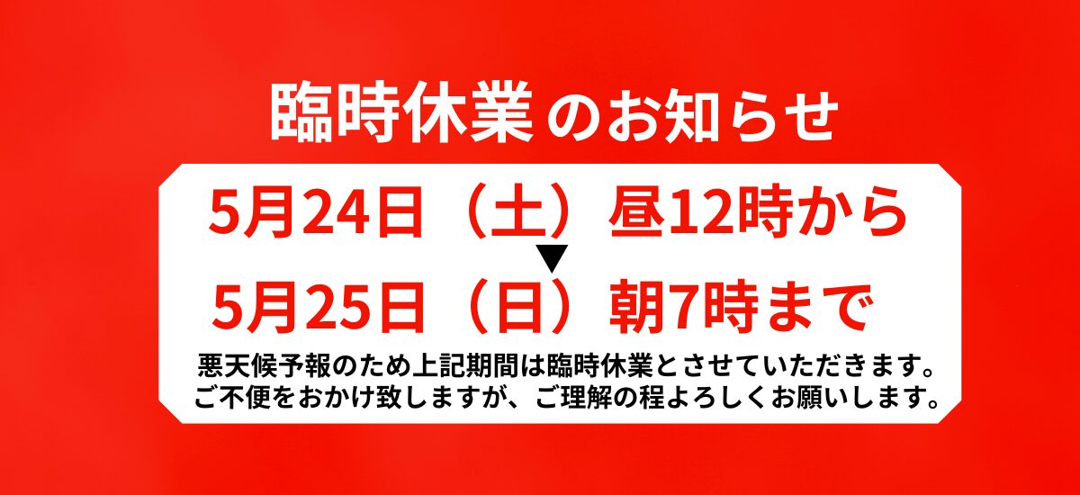 臨時休業のお知らせ。24日(土)12時~25日(日)7時 は悪天候のため両店休業とさせていただきます。