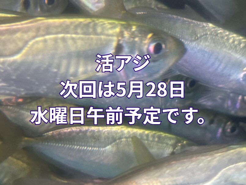 活アジ、次回は5月28日水曜日午前予定です。その間冷凍アジをご利用ください。