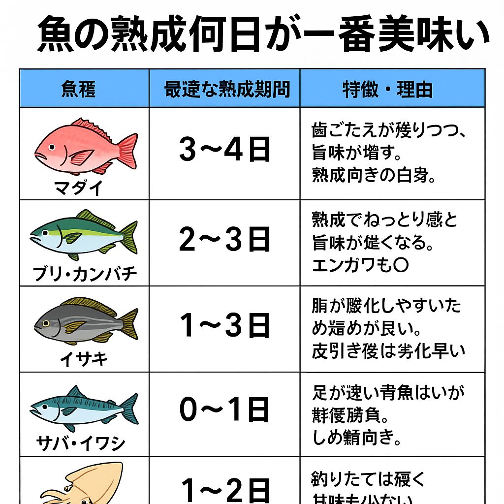 魚の熟成期間は「魚種・保存方法・温度」によって異なりますが、一般的には2日〜5日が最も美味しいとされることが多いです。以下に、魚種別の目安とその理由をわかりやすくまとめます。
