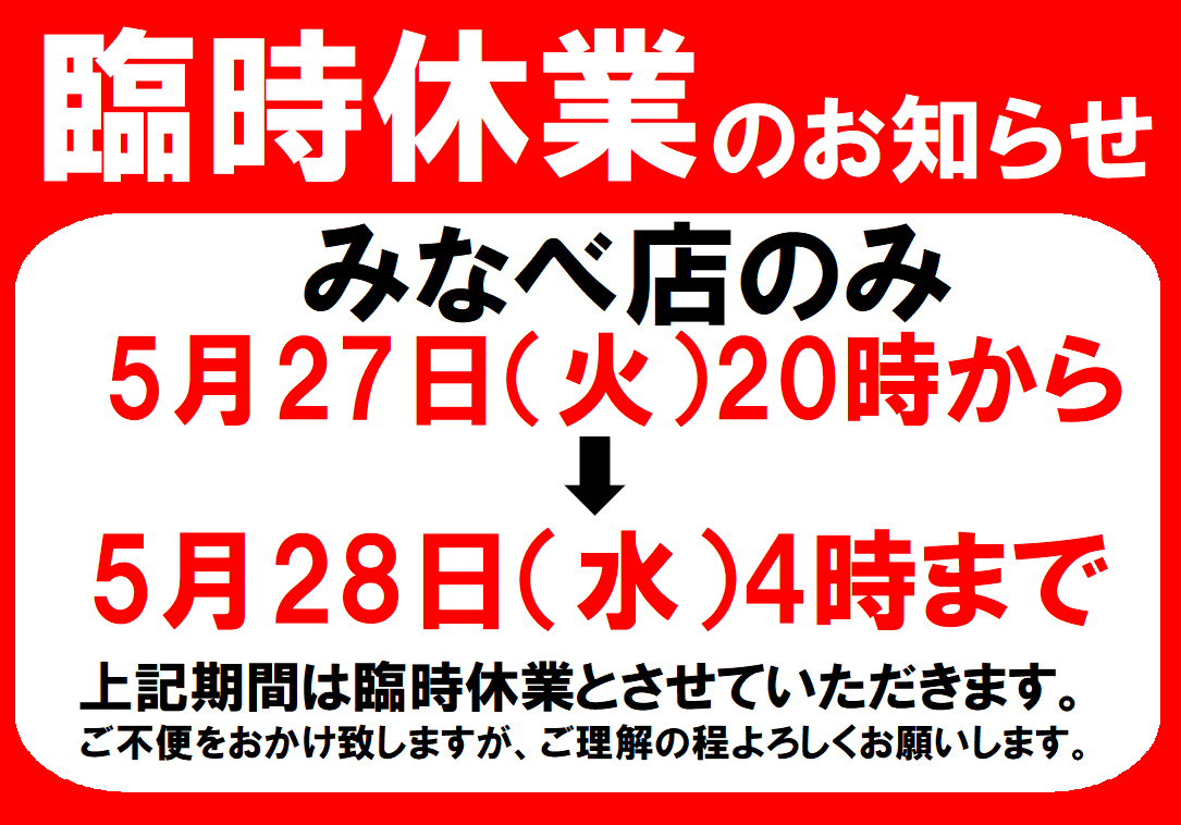みなべ店一時休業のお知らせ。27日20時~28日4時の8時間は休業させていただきます。