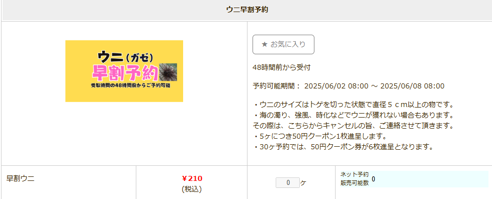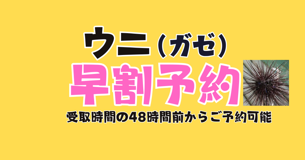 ウニ早割予約はじめました。【受取時間の48時間前から受付可能】 活エサ入荷情報 2025.05.31 次の週末分をご予約可能です。 ウニ5ヶ単位で50円クーポン券がつきます。 50ヶのご予約なら、50円×10枚となります。 ※5/31にご予約なら、6/2~6/8分のご予約が可能です。 みなべ店で予約 白浜店で予約