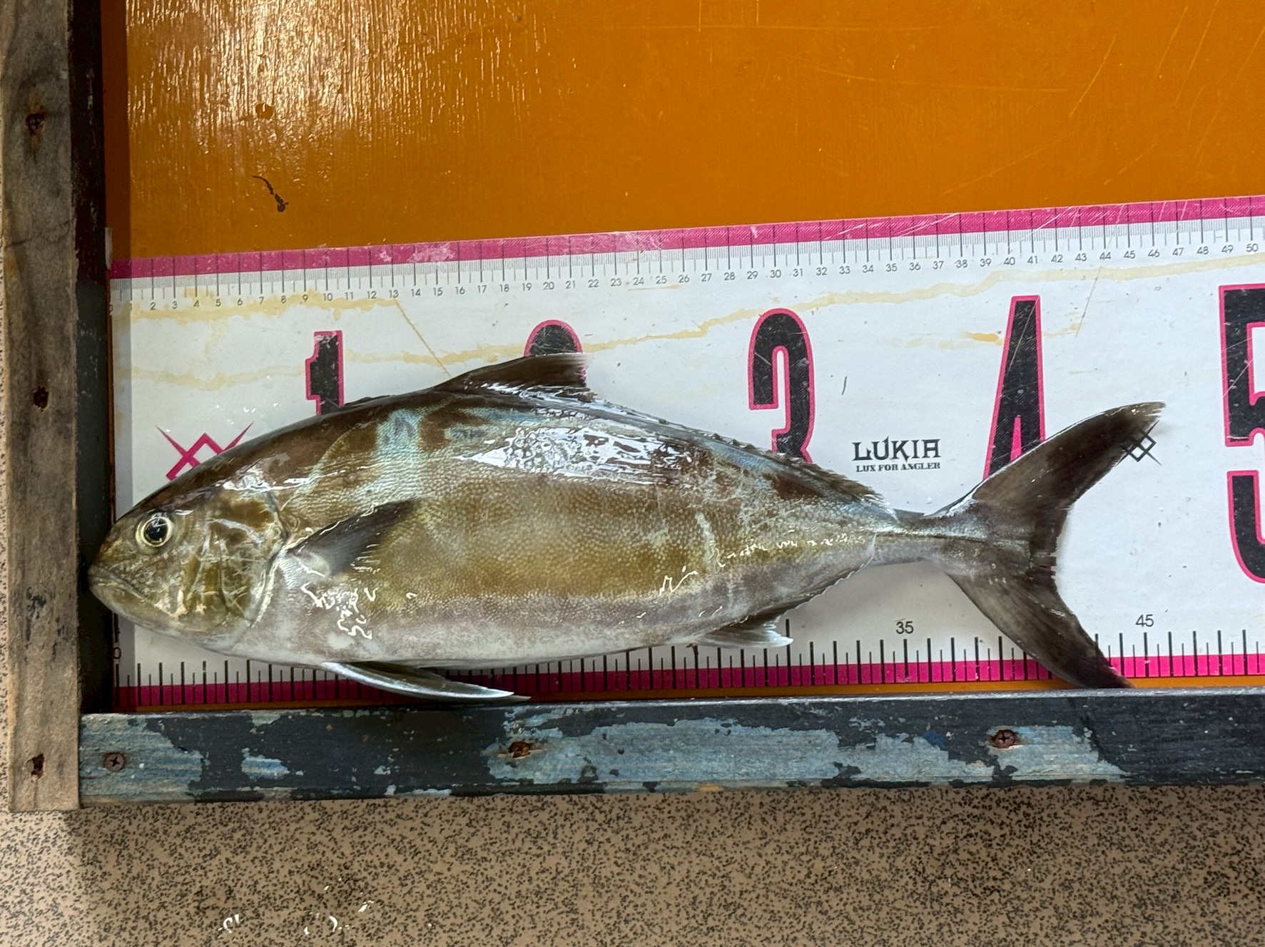 カンパチ46センチの釣果。釣った小サバを泳がせてのませ釣り。