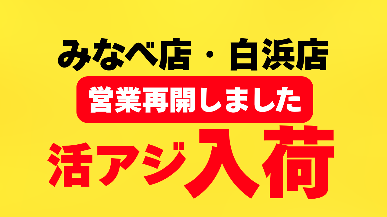 6/3みなべ店・白浜店 営業再開しました。活アジ入荷しています。