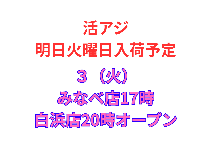 明日は臨時休業ですが、活アジ入荷予定です。 お知らせ 2025.06.02 今回も1500匹と少量しか入らないため、すぐに売り切れます。 ご了承ください。 電話は毎日ひっきりなしにかかってきますが、活アジ全国的に大不漁で入荷困難な状態は続いています。 3(火)はみなべ店17時、白浜店20時オープン。