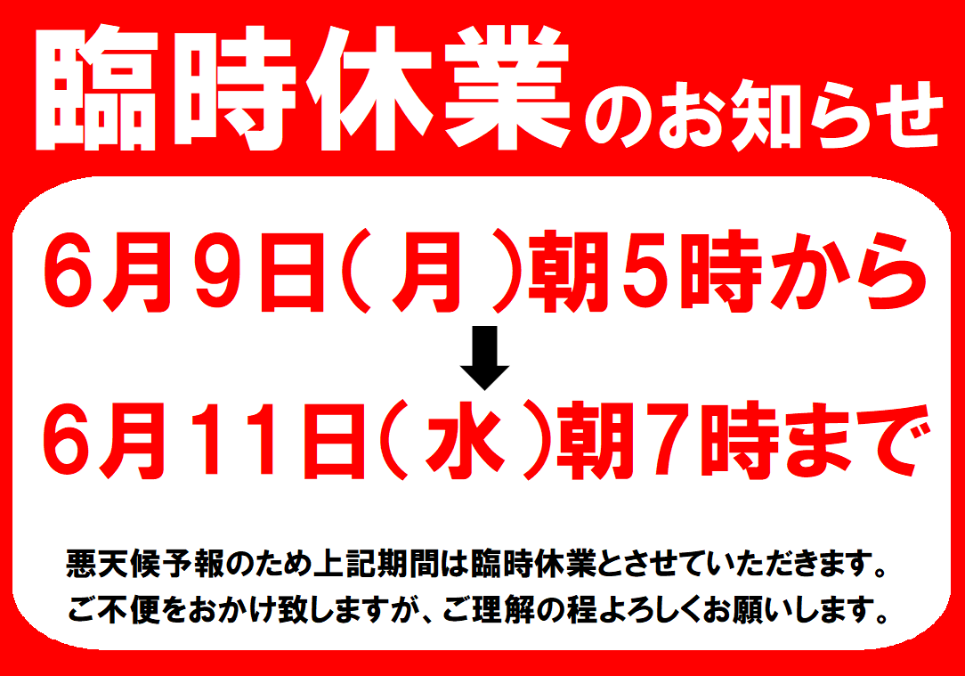 【臨時休業のお知らせ】6/9(月)朝5時~6/11(水)朝7時までは休業させていただきます。 お知らせ 2025.06.102025.06.08 悪天候予報の為、6/9(月)朝5時~6/11(水)朝7時までは休業させていただきます。 なお、天気の変動によって営業時間は変更となる可能性がございます。ご了承ください。