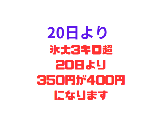 電気代高騰の為、約3キロ超の氷大、20日より400円となります。