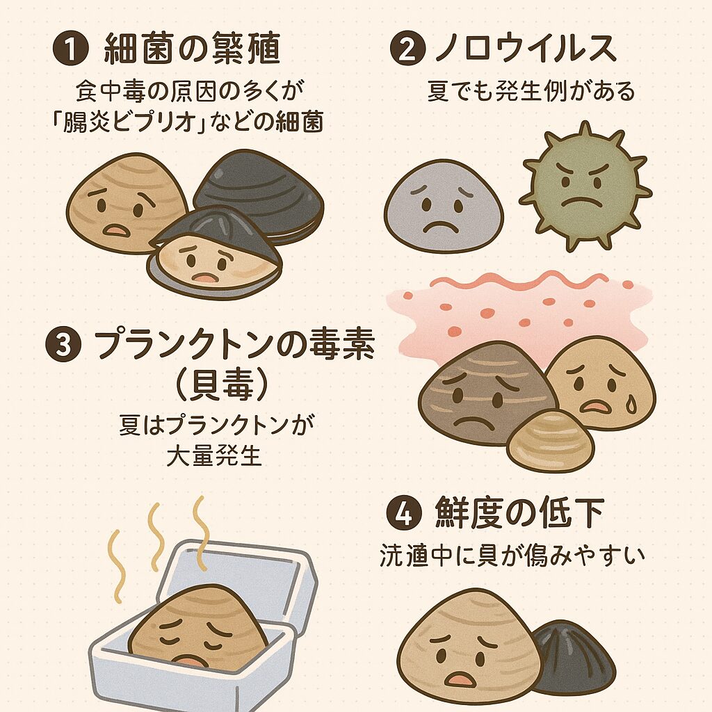 ・**夏は植物プランクトンの大量発生(赤潮)が起こりやすく、これを濾し取って食べる二枚貝(ホタテ・ムラサキイガイなど)が「麻痺性貝毒」や「下痢性貝毒」**を蓄積することがあります。