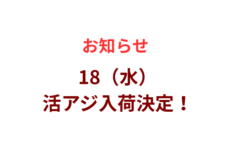 活アジ、次回入荷18(水)午前9時ごろ入荷します。 お知らせ 2025.06.15 25センチほどの大きなアジになります。 1000匹ほどしか入りません。 価格上がっていますが、そのまま275円(税込)とさせていただきます。