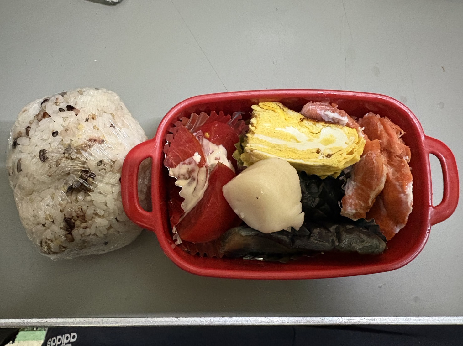 スタッフのお弁当日記 4日目 スタッフの自宅料理 2025.06.19 本日のお弁当は トマト ホタテ、、、、じゃなくて、ほぼホタテ(カニカマみたいな) 鮭の塩焼き 昨日の残りのナスの煮びたし ご飯は、世界一上手いおばあちゃんが作った米。 ヘルシー志向で十六穀を炊飯する時に入れています。