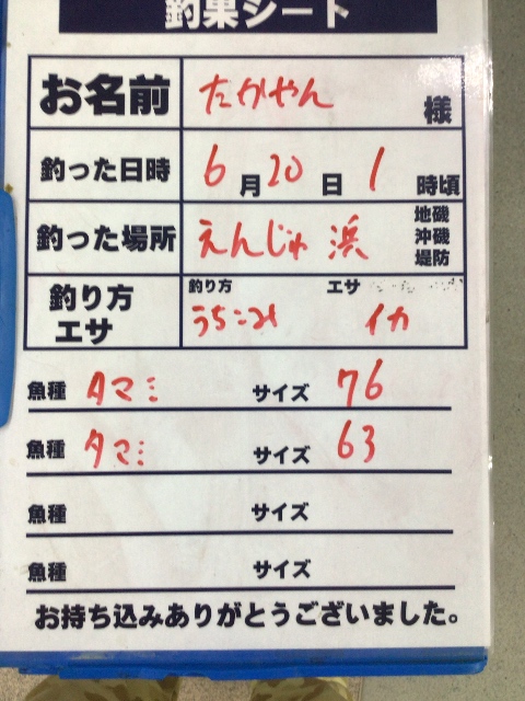 6/20 (金) 煙樹ヶ浜でタマミ76センチ他 打ち込みにて