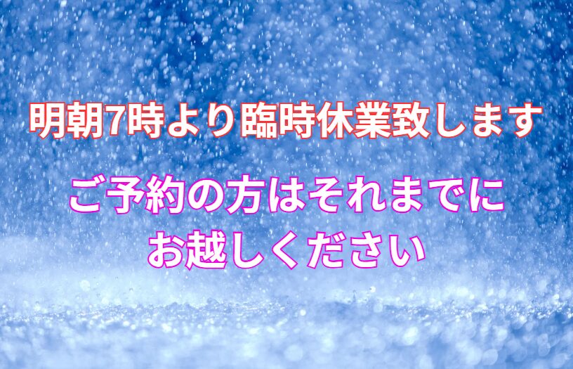 明朝7時より臨時休業致しますので、ご予約の方は遅れないようにお越しください。