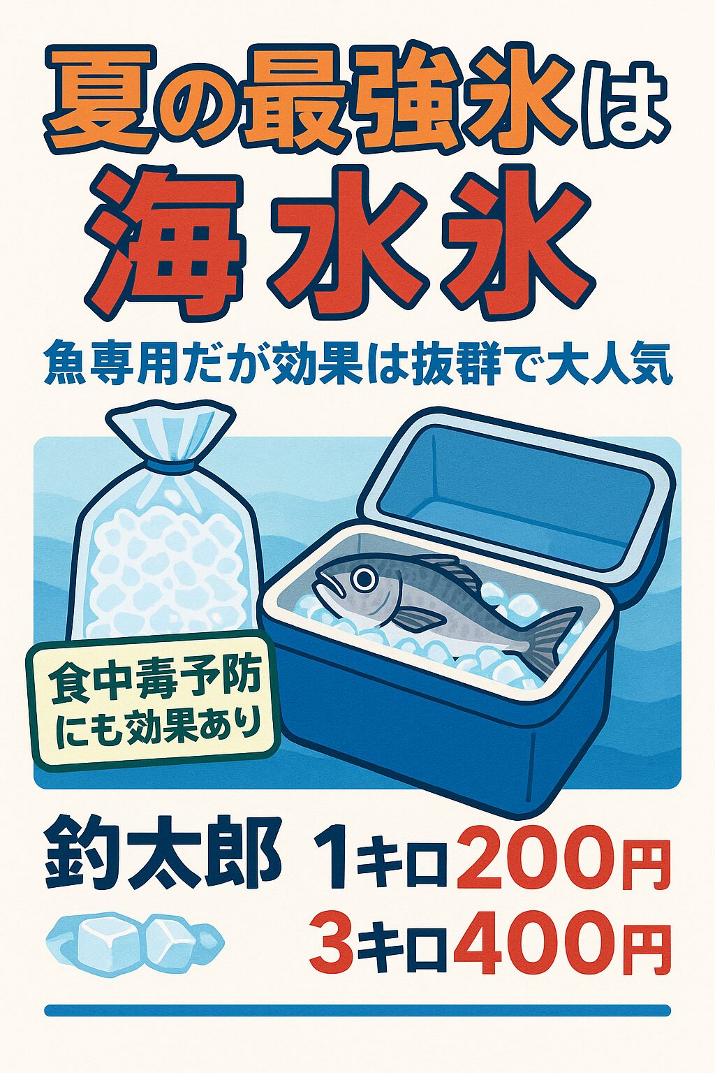 ・釣太郎では、鮮度と味を守る「プロ仕様の海水氷」を1キロ200円、3キロ400円で販売中。