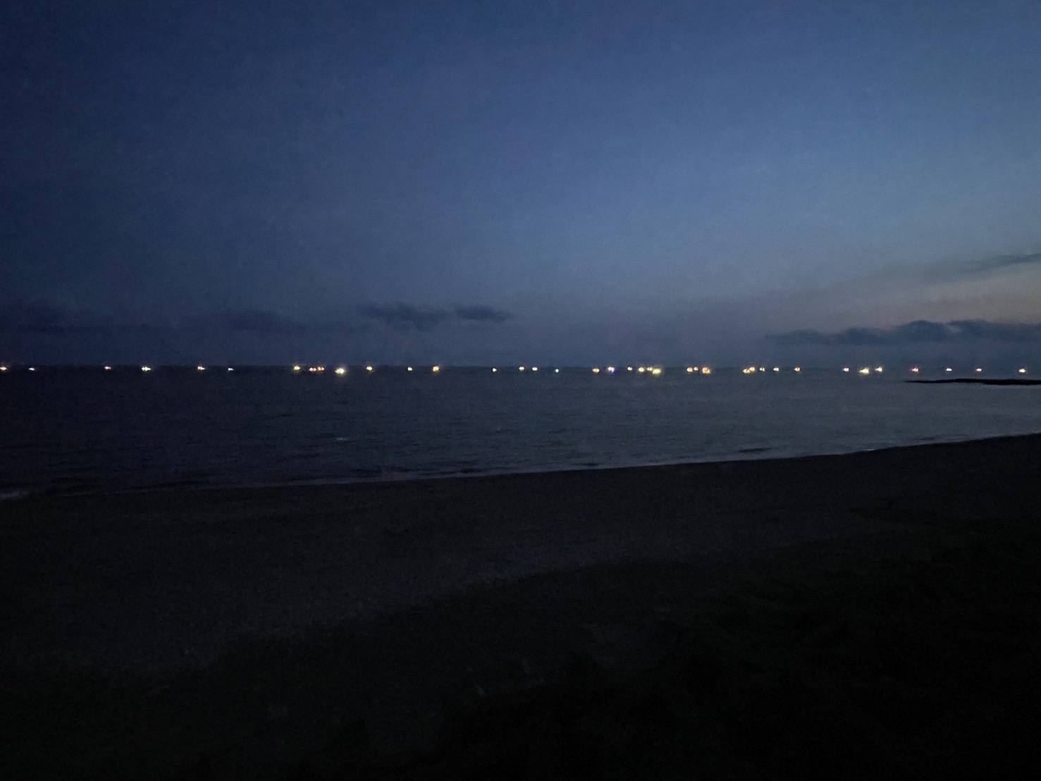 先日、自宅前の沖合にイカ釣り船がたくさん!