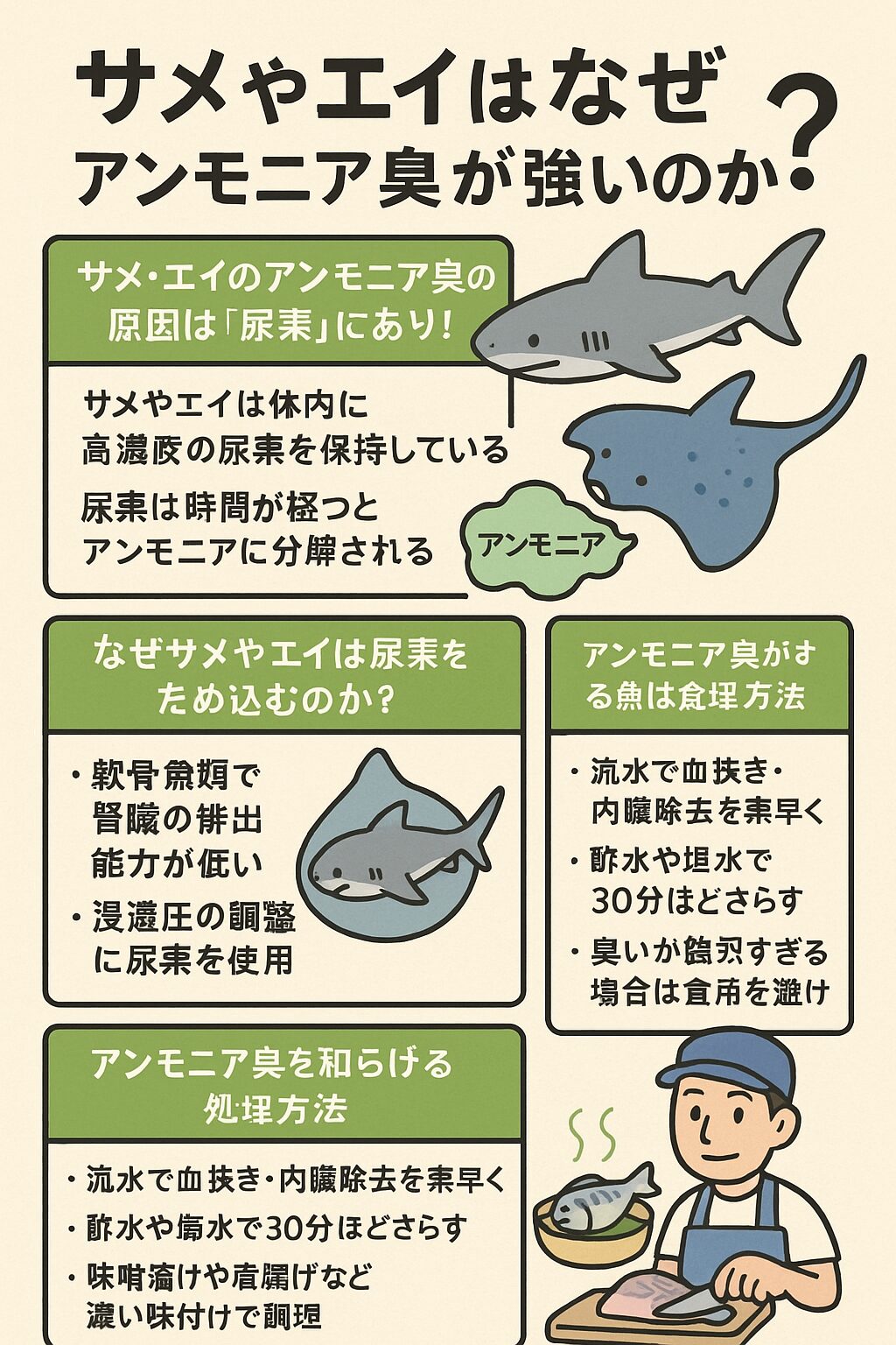 ✅結論から:サメ・エイのアンモニア臭の原因は「尿素」にあり!