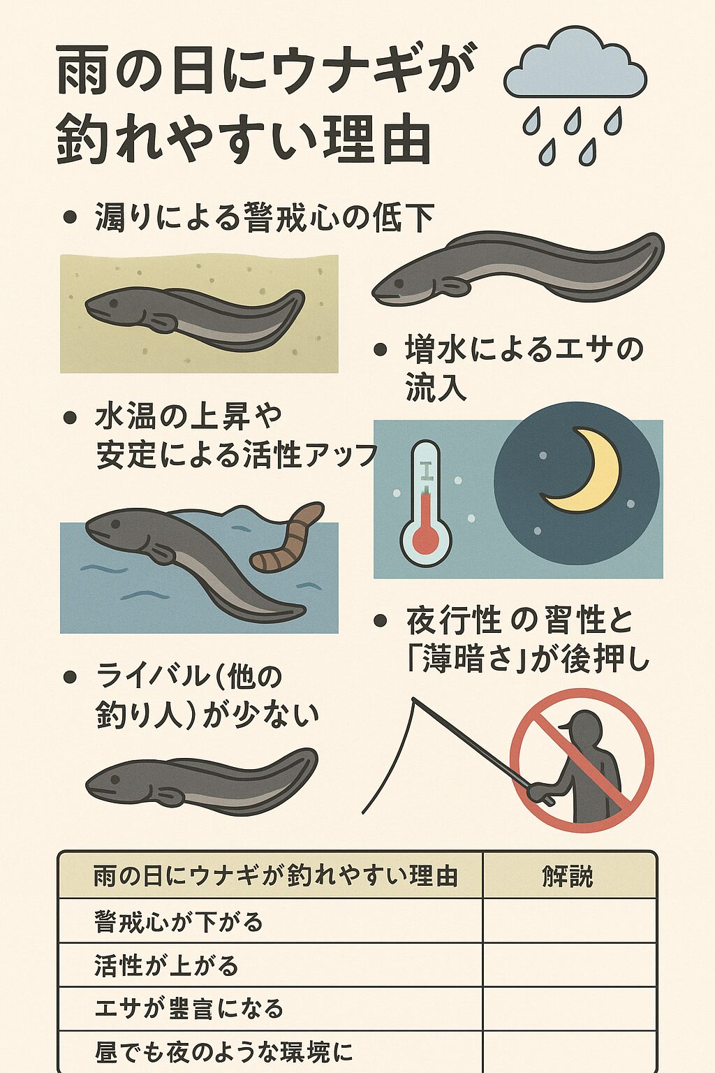 ・雨の日は釣り人が減るため、ウナギへのプレッシャーが低くなり、警戒心も薄れます。