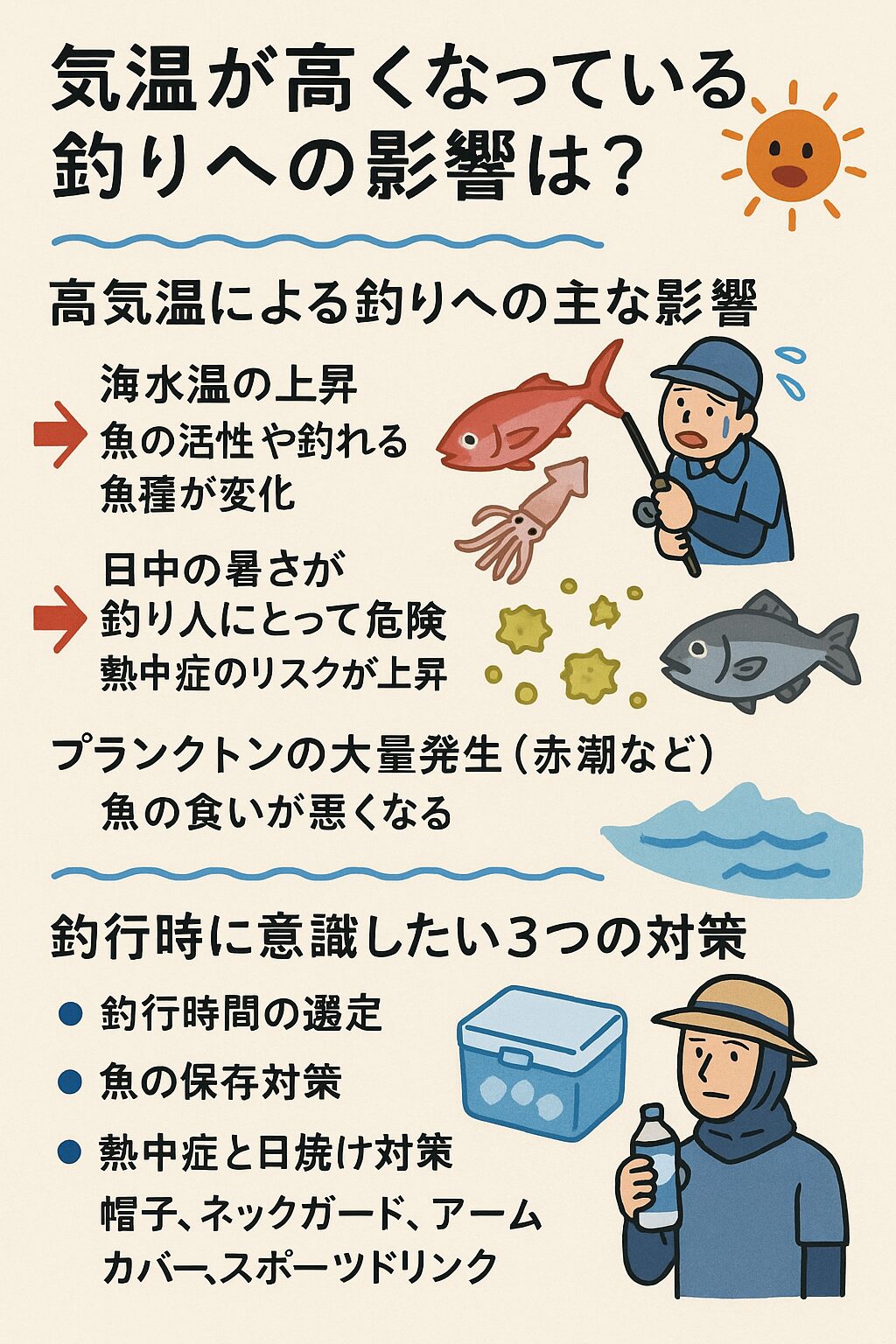 気温の上昇は「魚の活性・種類・居場所」だけでなく、「釣り人の安全・エサや魚の管理」にまで影響します。