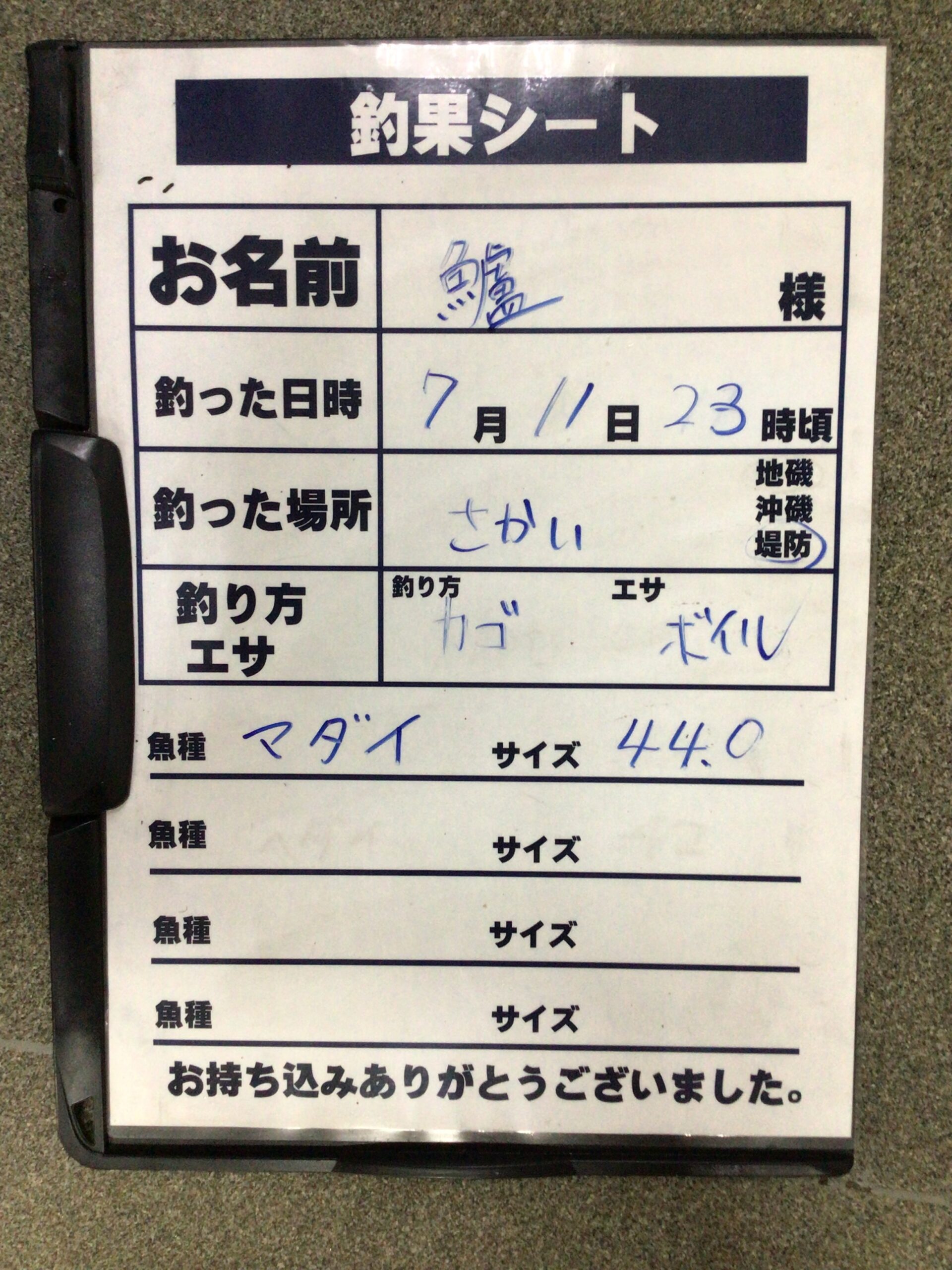 7月11日 鱸 様 マダイ44・0㎝の釣果。