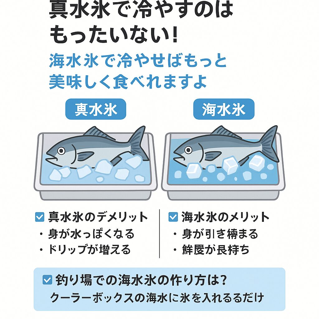 ・一方、**海水を凍らせた「海水氷」**は、魚にとってより自然で、鮮度を長時間キープし、味も落ちにくい理想の冷却手段。