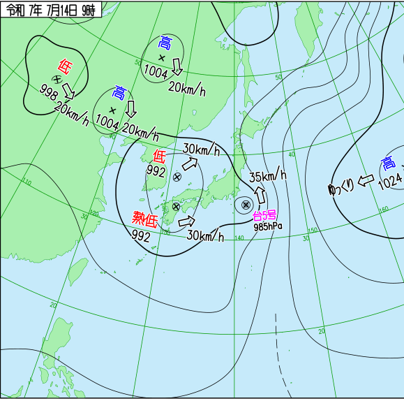 2025年7月14日午前9時現在の天気図から、関西圏は台風5号(985hPa)と低気圧に挟まれた不安定な気圧配置にあることが分かります。