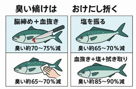 💡魚の臭いを90%近く抑えたいなら、血抜き+塩処理の併用が最強!