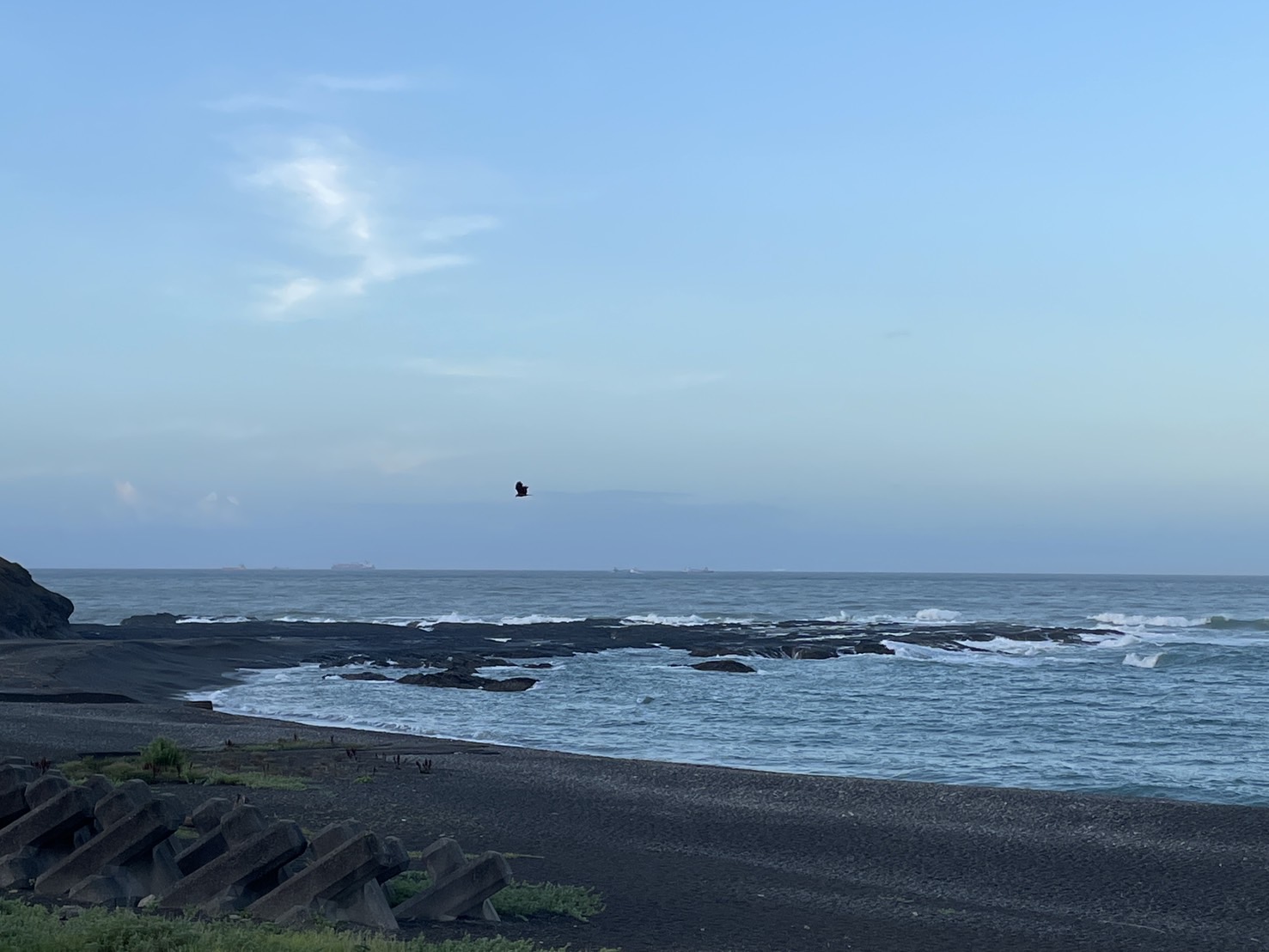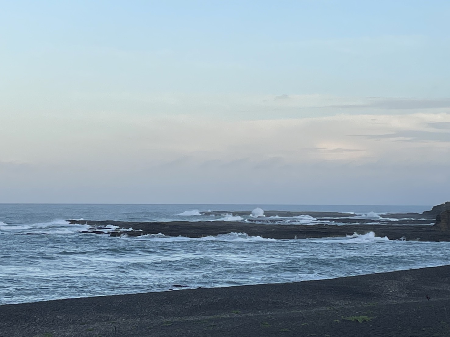 今日は天気も回復し 風もほとんどありませんが、 相変わらず波は高いです。7月18日(金)午前5時半撮影