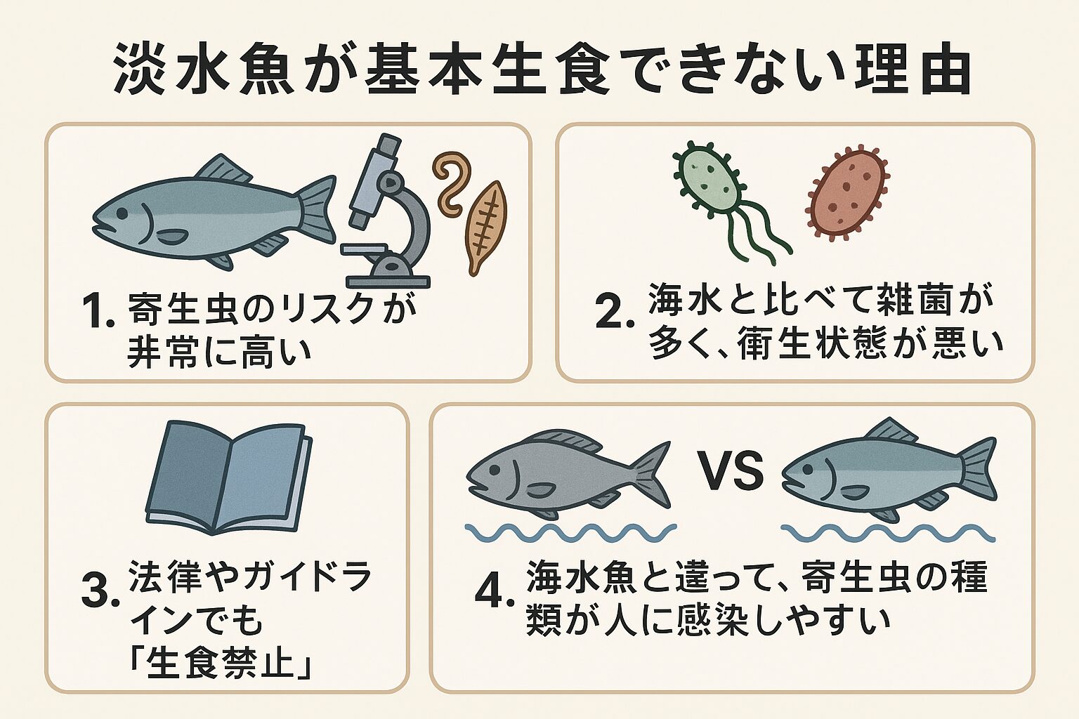 淡水魚には顎口虫(がっこうちゅう)、横川吸虫(よこがわきゅうちゅう)、**日本海裂頭条虫(にほんかいれっとうじょうちゅう)**など、人に感染する寄生虫が多く存在します。