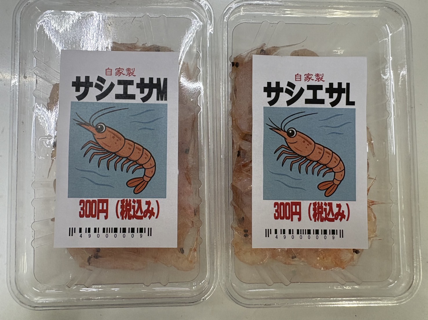 売り場は、虫えさの冷蔵庫に入っています。MとLで各5P置いています。