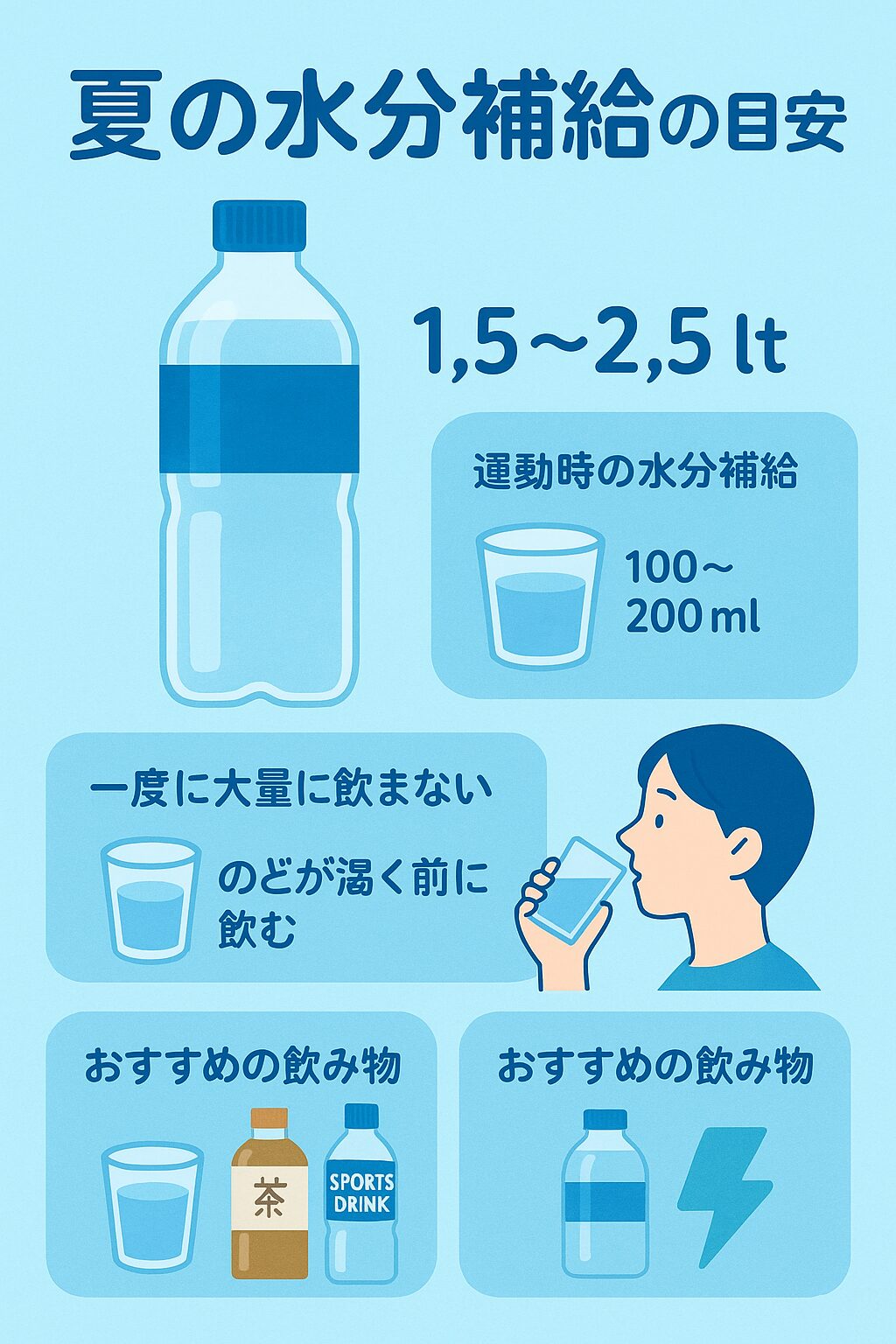 ・真夏日(30℃以上)や発汗量が多い日は、2~3リットルを意識。