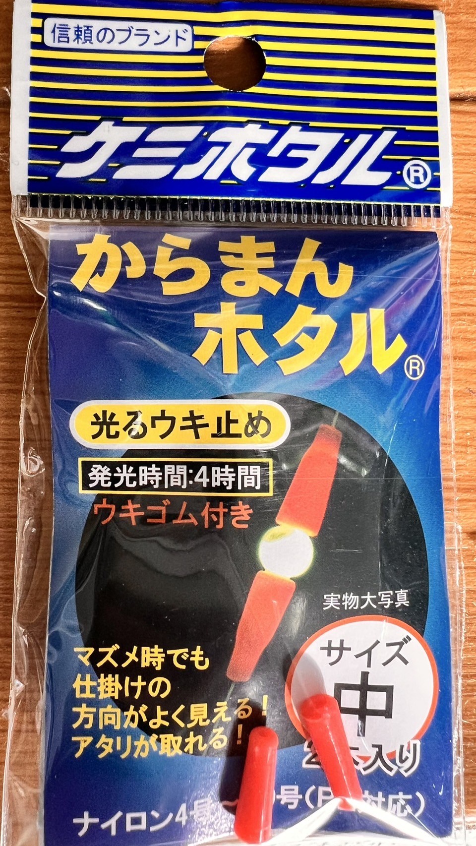 からまんホタルは、ナイロンライン4号~6号の道糸に対応した光るウキ止めです。