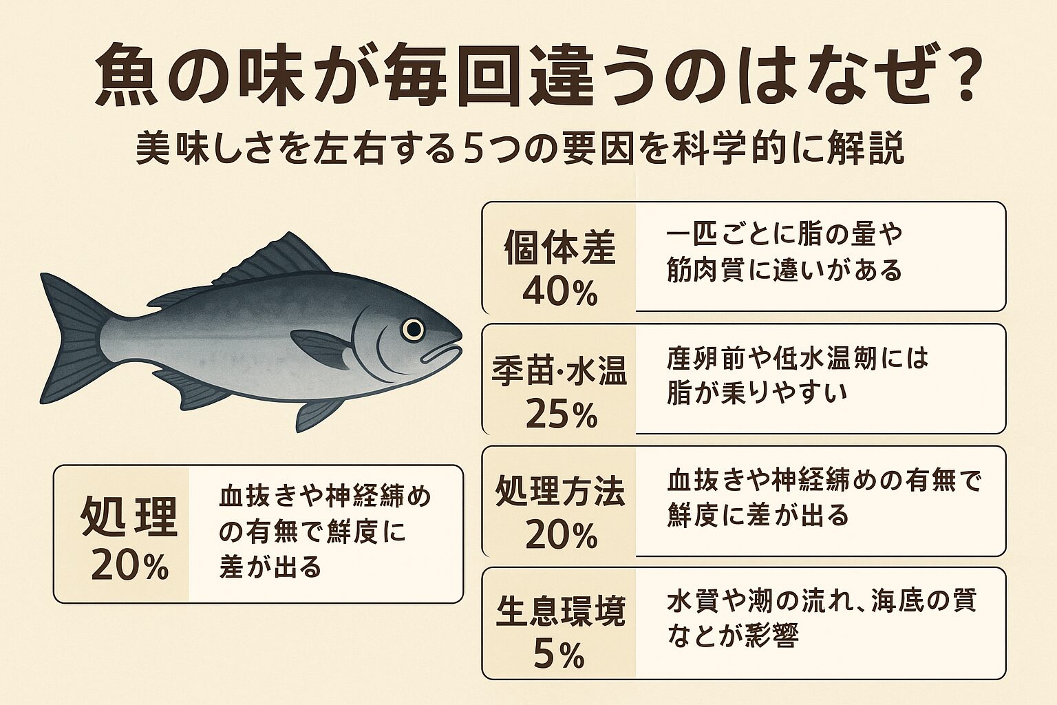 この記事では、この5つの要因がなぜ魚の味を変えるのかを、科学的視点から解説します。