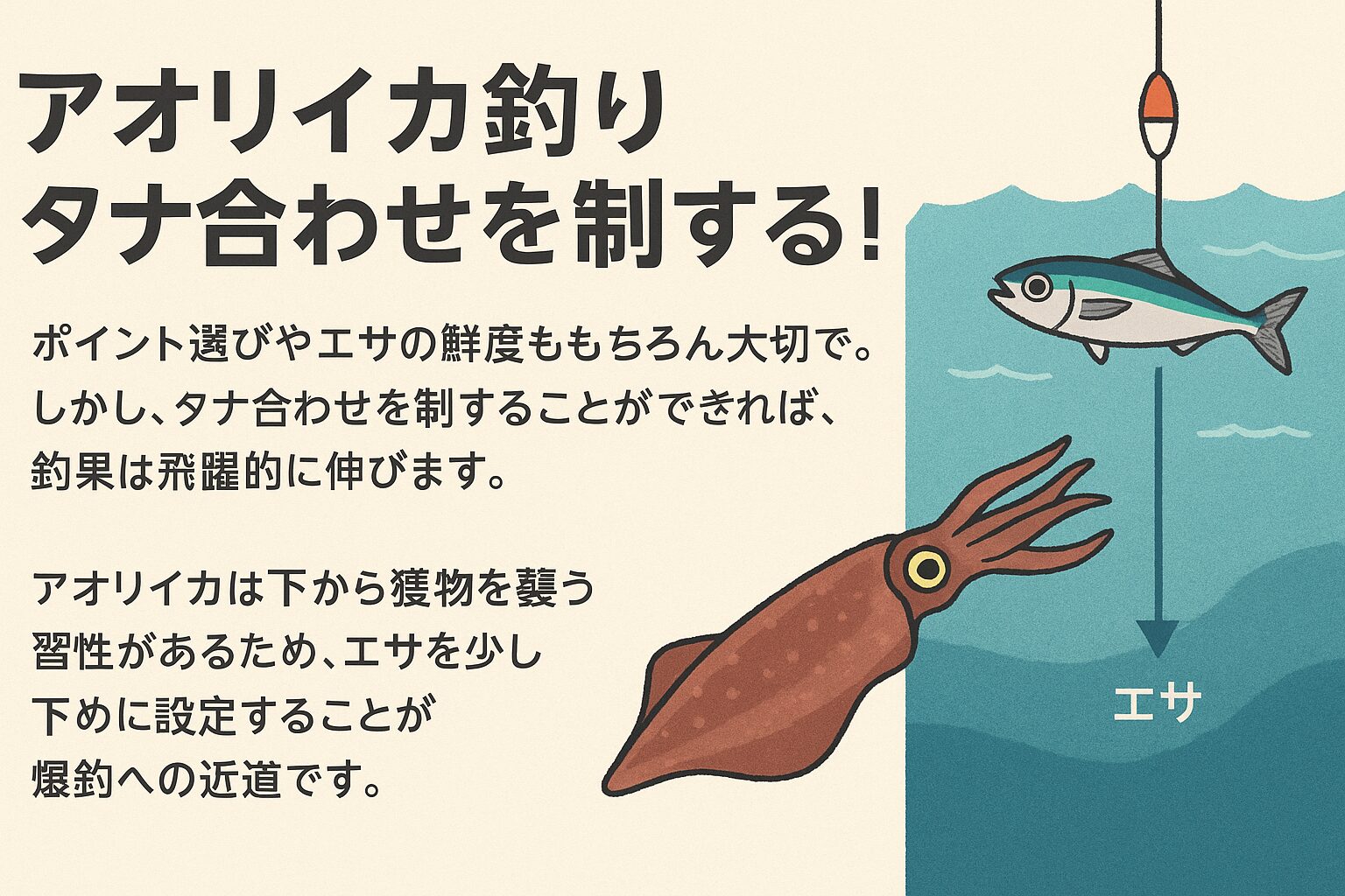 特にアオリイカは「下から獲物を襲う習性」を持つため、エサの位置を少し下めに設定することが爆釣への近道です。