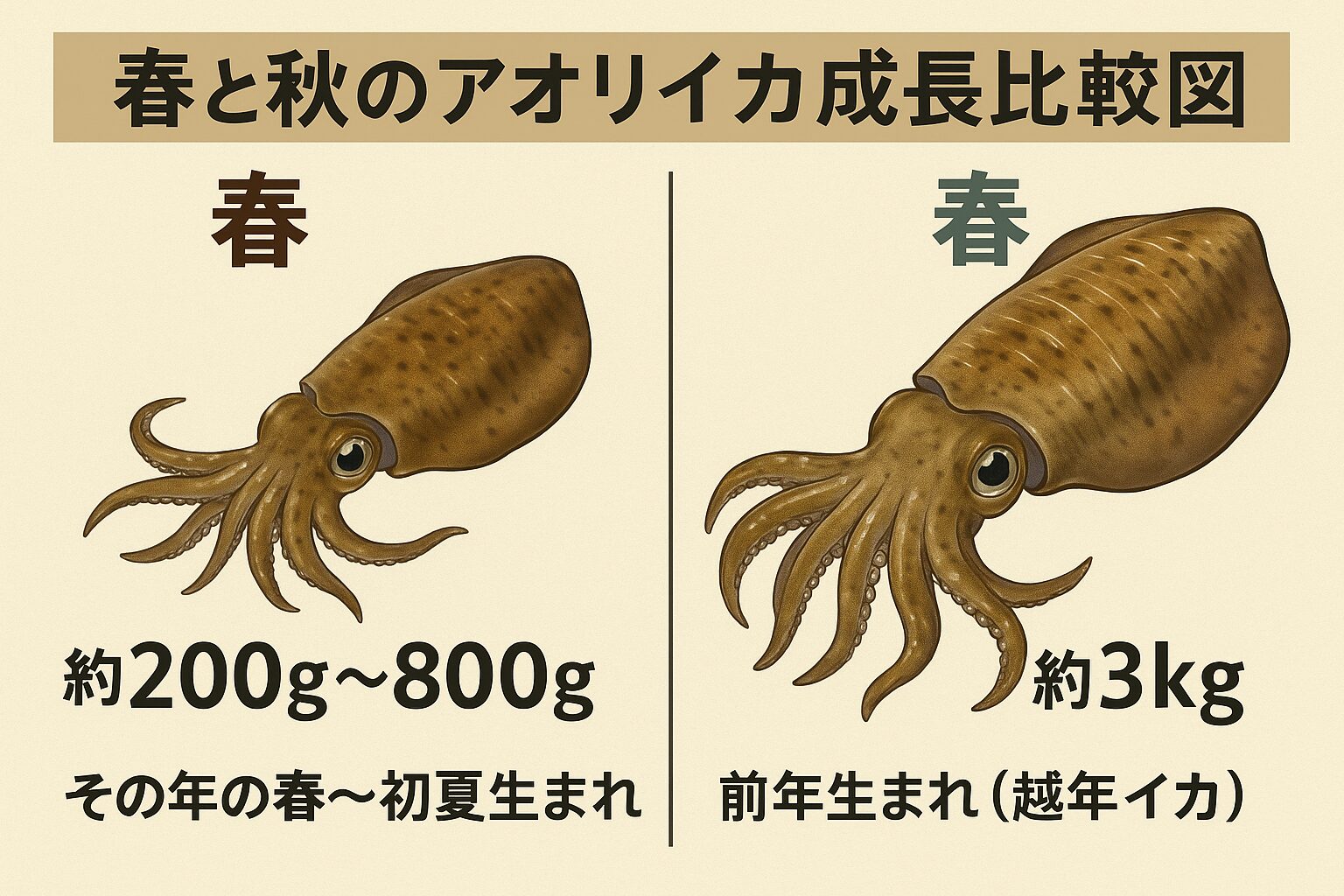 ・「秋に3キロ釣れた!」という場合、その個体はほぼ間違いなく越年イカ(前年生まれ)。